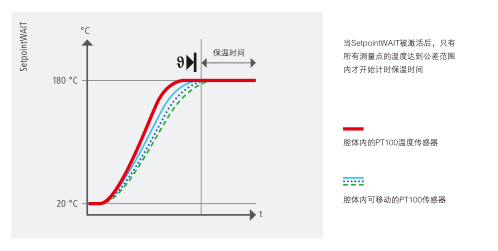 对仪器和实验室设备进行高温灭菌时,精确定时的温度控制能够帮助拯救生命。因此,SetpointWAIT功能保证只有到达设定温度才会开始计时灭菌时间。额外使用可自由定位的Pt100传感器(可选)进行测量时,所有测量点必须均达到设定温度,这对继续执行程序而言至关重要。ControlCOCKPIT上会直接显示最多三个测量值,或在外部测试装置或4-20mA接口上显示一个测量值。