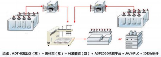 该系统由1台ASP2000平台同时控制两台溶出仪,不仅可以完成溶出、采样和补液工作、还具备自动稀释、UV/HPLC进样、UV检测以及数据分析的功能。